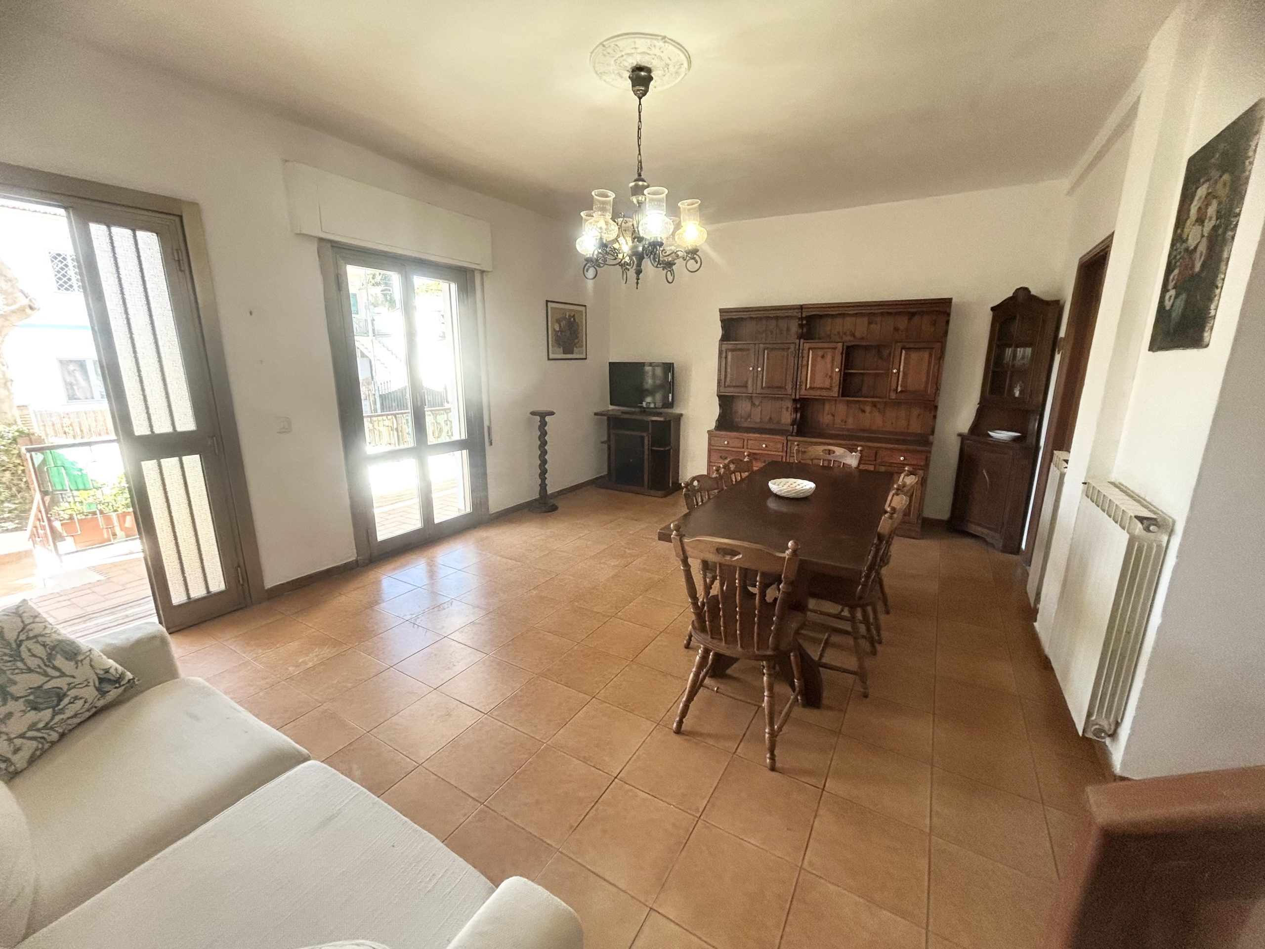Piano terra giardino mattonato, ingresso in sala con terrazzo, disimpegno, cucina, bagno.